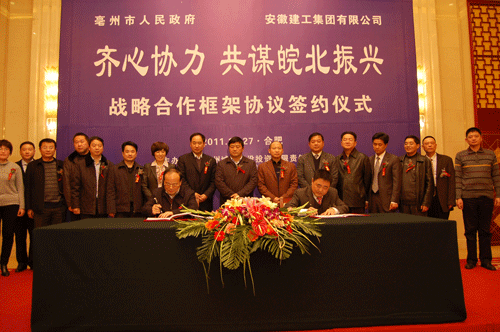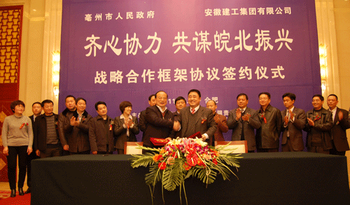 2011年12月27日,由我公司和亳州城市建設(shè)投資有限責(zé)任公司共同承辦的安徽建工集團(tuán)與亳州市政府戰(zhàn)略合作框架協(xié)議簽約儀式,在合肥稻香樓賓館隆重舉行。亳州市委書記、市人大常委會(huì)主任方春明,市委副書記、市長(zhǎng)沈強(qiáng)等市委市政府領(lǐng)導(dǎo),集團(tuán)公司董事長(zhǎng)、黨委書記胡運(yùn)成,總經(jīng)理、副董事長(zhǎng)、黨委副書記趙時(shí)運(yùn)等集團(tuán)領(lǐng)導(dǎo)出席簽約儀式。
