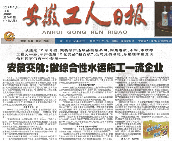 “我和同事們有一個夢想,那就是把安徽交航打造成中部綜合性水運施工一流企業(yè)?!闭f到這里,李世龍有些激動了。