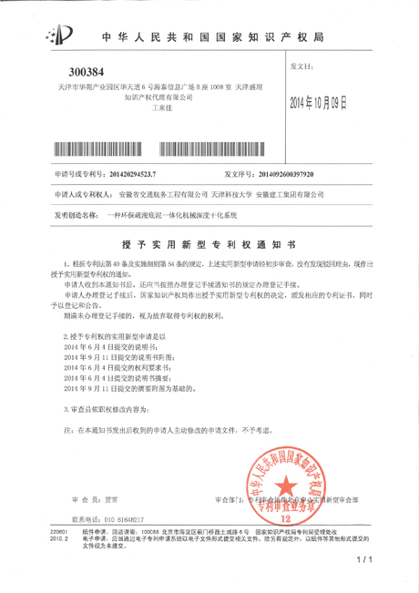 近日,國家知識產(chǎn)權總局專利管理司傳來喜訊,交航公司獲得兩項實用新型專利授權,《一種環(huán)保疏浚底泥一體化機械深度干化系統(tǒng)》,專利號:201420294523.7,《一種環(huán)保疏浚余水/尾水凈化人工濕地系統(tǒng)》,專利號:201420326634.1,這是交航公司重視“科技興企”戰(zhàn)略的重要成果,實現(xiàn)了交航公司在專利申請方面零的突破,同時為提高公司技術能力和深入實施“科技興企”戰(zhàn)略打下了堅實的基礎。