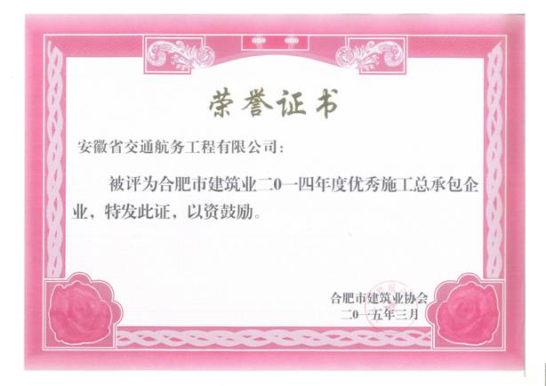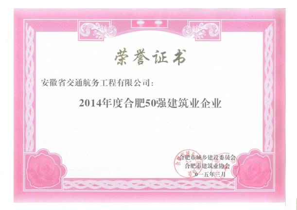 近日,合肥市建筑業(yè)協(xié)會公布了2014年度合肥市建筑業(yè)企業(yè)表彰名單,我公司榜上有名,喜獲“合肥市建筑業(yè)企業(yè)50強(qiáng)”、“合肥市優(yōu)秀施工總承包企業(yè)”兩項榮譽(yù)稱號。