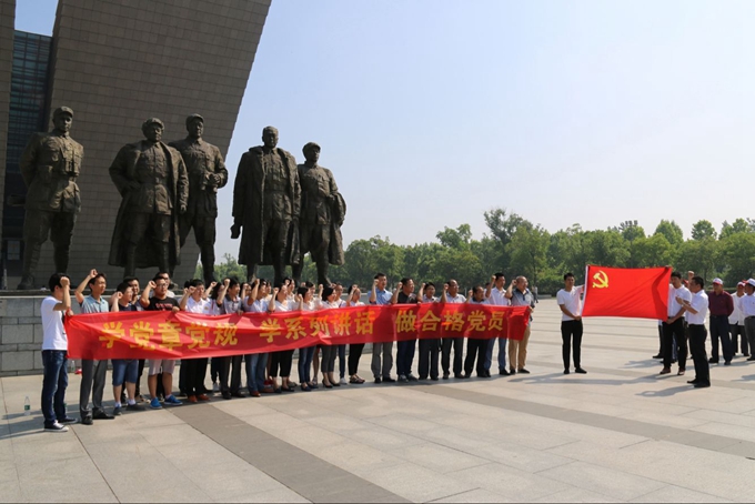在渡江戰(zhàn)役紀(jì)念館雕像前,在機(jī)關(guān)支部委員帶領(lǐng)下,大家面對(duì)鮮紅的黨旗舉起右拳,莊嚴(yán)宣誓。