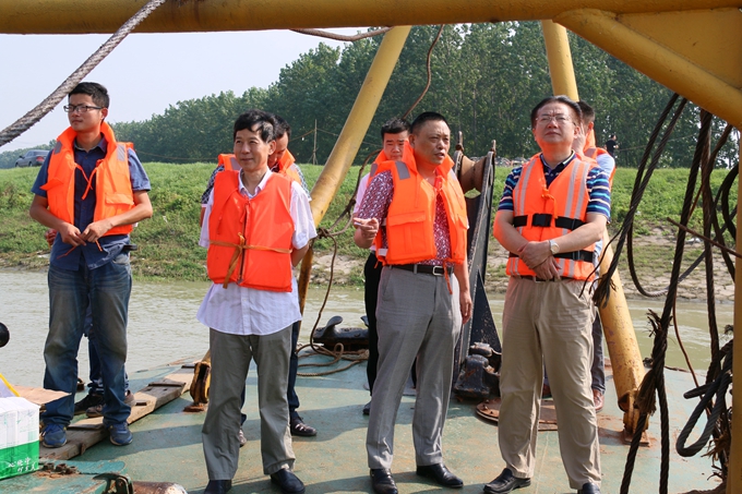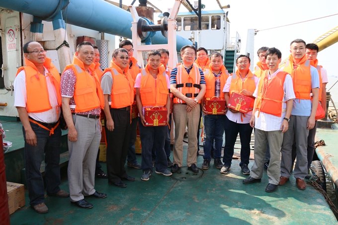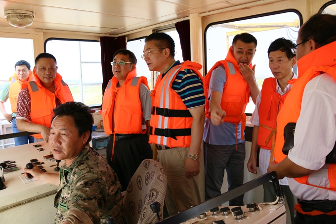在交通艇上,劉總認(rèn)真聽(tīng)取了安徽交航青弋江疏浚項(xiàng)目的詳細(xì)介紹,了解了施工進(jìn)度和下一步施工計(jì)劃。登船后與船員們一一握手、親切交談,詢問(wèn)他們生活飲食情況、防暑降溫措施,隨后登上船舶操作室,詳細(xì)了解挖泥船施工技術(shù),通過(guò)GPS定位觀察位于水下的施工作業(yè)面積。劉總囑咐船員們?cè)诖献鳂I(yè)要注意安全,在酷暑天氣保障生產(chǎn)進(jìn)度的同時(shí)切實(shí)做好防暑降溫工作,確保健康防暑、平安防暑。