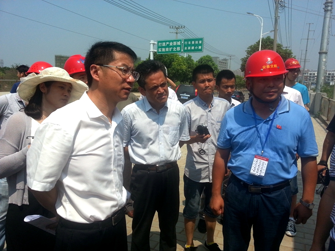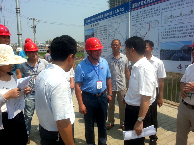 2016年7月28日上午10時,巢湖市市長張生在巢湖市重點局局長袁浩及相關(guān)人員陪同下,蒞臨安徽交航承建的亞父路工程施工現(xiàn)場,視察指導工作。