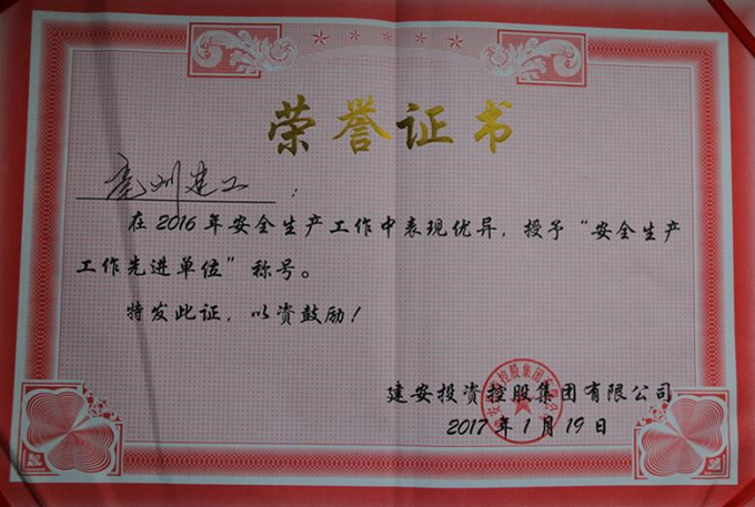 1月19日,在建安集團(tuán)組織召開的2016年第四季度暨年度安全生產(chǎn)工作總結(jié)會(huì)上,建安集團(tuán)授予亳州建工有限公司“安全生產(chǎn)工作先進(jìn)單位”榮譽(yù)稱號(hào)。