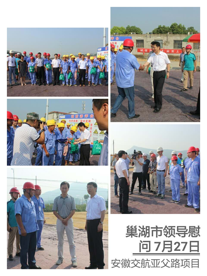 2017年7月27日上午,巢湖市市委副書記、市長張生在巢湖市總工會、重點(diǎn)局主要領(lǐng)導(dǎo)的陪同下,冒著酷暑來到我公司亞父路項(xiàng)目部施工現(xiàn)場檢查慰問,為大家送來了夏季防暑降溫用品。