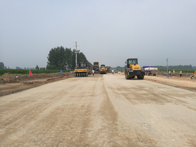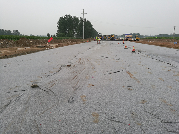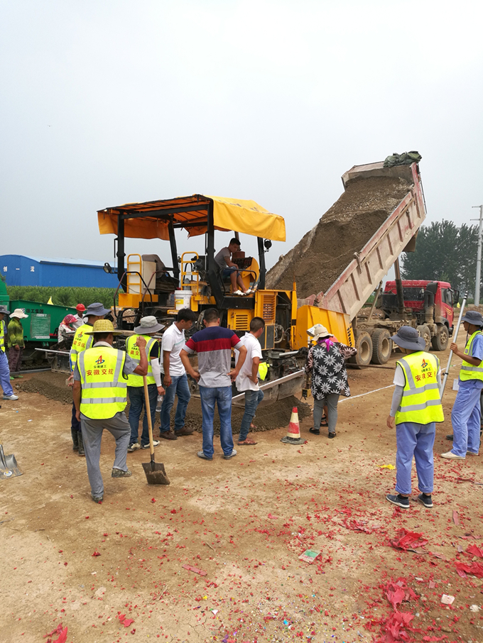 8月5日,蕭楊路水穩(wěn)試驗(yàn)段開始攤鋪,此次水穩(wěn)試驗(yàn)段長(zhǎng)度200米。上午10時(shí),隨著第一車水穩(wěn)混合料緩緩倒入攤鋪機(jī)料斗時(shí),標(biāo)志著蕭楊路成功完成工序的轉(zhuǎn)換,也標(biāo)志著我項(xiàng)目進(jìn)入路面基層施工的新階段。