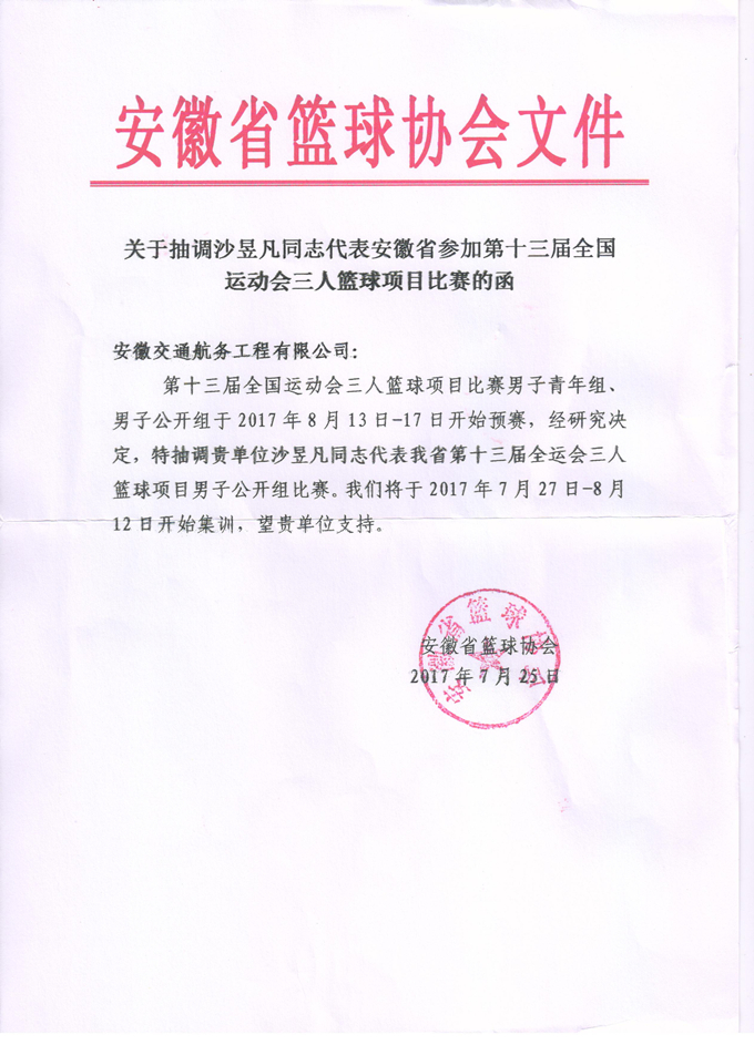 7月25日,安徽省籃球協(xié)會向安徽交航公司發(fā)函,抽調(diào)安徽交航員工沙昱凡代表安徽省參加第十三屆全國運動會三人籃球項目比賽。沙昱凡為我公司法務(wù)專員,球技精湛,在省內(nèi)籃球界享有一定知名度。接到此函后,安徽交航領(lǐng)導(dǎo)高度重視,要求公司法務(wù)部、人力資源部、工會全力配合省籃協(xié),協(xié)調(diào)好運動員的工作,保證充足的集訓(xùn)和比賽時間,爭取在第十三屆全運會上為我省籃球事業(yè)爭光。