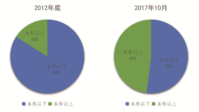 學歷結(jié)構(gòu)方面,具有研究生學歷的18人,增加16人,增幅為800%;具有本科學歷的178人,增加141人,增幅為381.1%,本科及以上職工總量比例由原來的16%提高到48%。