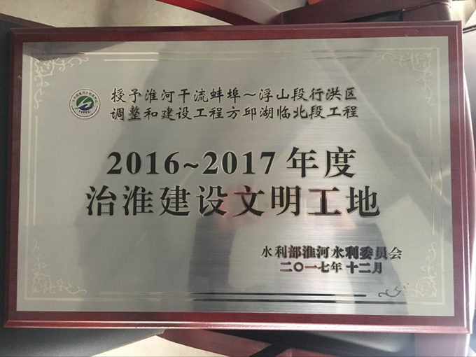2018年1月17日,水利部淮河水利委員會召開關于2016-2017年度治淮建設文明工地總結會議,淮河干流蚌埠~浮山段行洪區(qū)調(diào)整和建設工程方邱湖臨北段工程榮獲“2016-2017年度治淮建設文明工地”獎牌。淮河干流蚌埠~浮山段行洪區(qū)調(diào)整和建設工程方邱湖臨北段工程段安徽省交通航務工程有限公司單位榮獲廳級“2016-2017年度治淮建設文明工地”稱號。