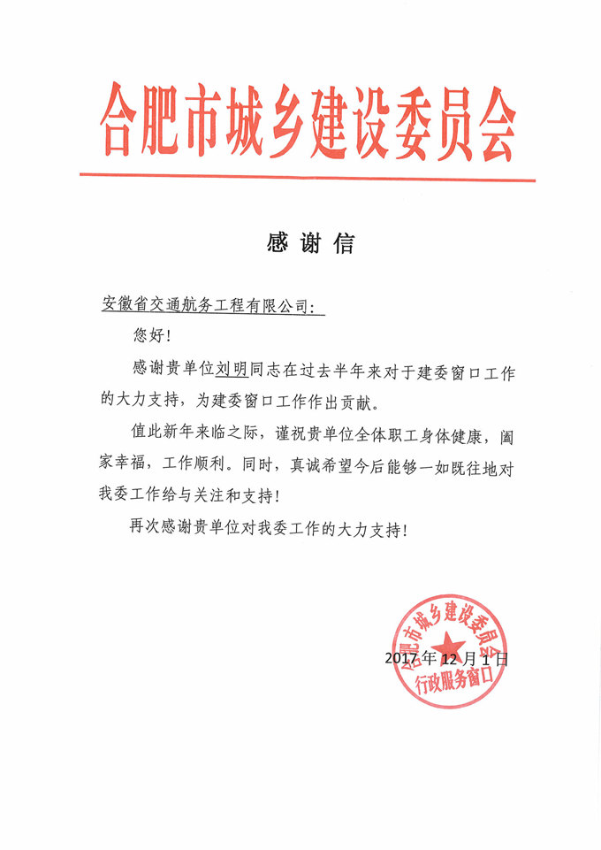 2018年5月7日下午,我公司收到合肥市城鄉(xiāng)建設(shè)委員會(huì)的關(guān)于對(duì)我公司資質(zhì)辦員工劉明同志的感謝信。
