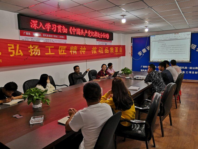 10月9日,廣德路項目部積極響應(yīng)上級要求,召開了黨支部擴(kuò)大會議,組織項目部全體職工認(rèn)真學(xué)習(xí)新修訂的《中國共產(chǎn)黨紀(jì)律處分條例》。