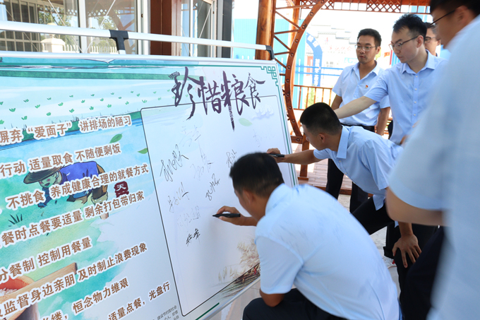 活動(dòng)現(xiàn)場(chǎng),10余名項(xiàng)目部黨員干部舉起右手莊重承諾:“理性消費(fèi),摒棄愛(ài)面子講排場(chǎng)的陋習(xí);加入光盤(pán)行動(dòng),適量取食,不隨便剩飯;不偏食、不挑食,養(yǎng)成健康合理的就餐方式;餐館用餐時(shí)點(diǎn)餐要適量,剩余打包帶回家;推行分餐制,控制用餐量;積極監(jiān)督身邊親朋 及時(shí)制止浪費(fèi)現(xiàn)象?!蓖瑫r(shí),全體黨員干部紛紛表示,一粥一飯,當(dāng)思來(lái)之不易,拒絕浪費(fèi)、厲行節(jié)約,應(yīng)從我們每個(gè)人做起,適量點(diǎn)餐、光盤(pán)行動(dòng),應(yīng)從我們每個(gè)人做起。