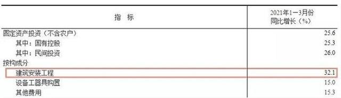 由上圖可見,2021年1-3月份,建筑安裝工程投資同比增長32.1%。