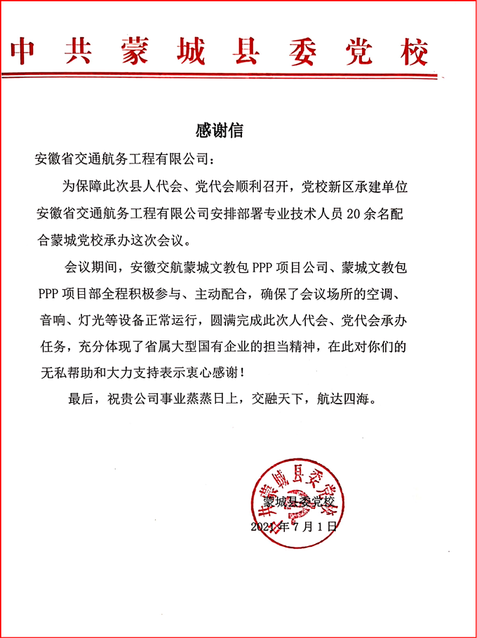 會議期間,蒙城文教包PPP項(xiàng)目公司、蒙城文教包PPP項(xiàng)目部安排20余名專業(yè)技術(shù)人員全程積極參與、主動配合,周密部署、精心安排,以“嚴(yán)之又嚴(yán)、細(xì)之又細(xì)、實(shí)之又實(shí)、全之又全”的態(tài)度,派駐專業(yè)技術(shù)人員24小時(shí)對會場的空調(diào)、音響、燈光等設(shè)備進(jìn)行維護(hù)調(diào)試,保障了會議期間會場設(shè)備安全運(yùn)行,圓滿完成了此次人代會和黨代會承辦任務(wù)。為此,蒙城縣委黨校發(fā)來感謝信,對蒙城項(xiàng)目公司的全力配合和無私幫助表示感謝,并祝安徽交航事業(yè)蒸蒸日上。
