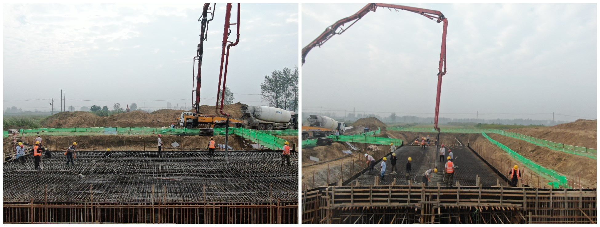 自儀式啟動(dòng)以來(lái),為快速掀起大干快干熱潮,確保年底完成既定進(jìn)度產(chǎn)值,泗縣長(zhǎng)三角產(chǎn)業(yè)園項(xiàng)目緊緊圍繞項(xiàng)目年度生產(chǎn)任務(wù),秉持“工期就是效益”的理念,主動(dòng)對(duì)標(biāo)長(zhǎng)三角一體化發(fā)展城鄉(xiāng)建設(shè)示范性勞動(dòng)和技能競(jìng)賽,充分發(fā)揮主人翁精神和主力軍作用,確保項(xiàng)目工期、產(chǎn)值等各項(xiàng)任務(wù)圓滿實(shí)現(xiàn)。今年9月9日,在炎熱高溫天氣下,泗縣長(zhǎng)三角產(chǎn)業(yè)園項(xiàng)目龍河路箱涵,在超長(zhǎng)雨季間歇期完成的底板混凝土澆筑、頂板及側(cè)墻鋼筋綁扎、模板支設(shè),經(jīng)過監(jiān)理單位驗(yàn)收合格,終于迎來(lái)了頂板及側(cè)墻混凝土的澆筑。由于混凝土澆筑方量大,項(xiàng)目部提前向商混站報(bào)備所需泵車、混凝土標(biāo)號(hào)、方量,預(yù)計(jì)澆筑時(shí)間等計(jì)劃。9日清晨6點(diǎn)鐘,項(xiàng)目部技術(shù)管理人員到達(dá)磅房和施工位置,指揮泵車過磅,安排工人測(cè)溫及班前培訓(xùn)。在施工過程中,項(xiàng)目部技術(shù)管理人員時(shí)刻與工人一起,送藥送水,極大地鼓舞了廣大工人的生產(chǎn)熱情,經(jīng)過八個(gè)小時(shí)連續(xù)奮戰(zhàn),澆筑任務(wù)圓滿完成。