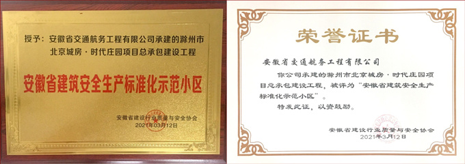 近日,從安徽省建筑行業(yè)質(zhì)量與安全協(xié)會傳來喜訊,安徽交航公司承建的滁州時代莊園項(xiàng)目榮獲“安徽省建筑安全生產(chǎn)標(biāo)準(zhǔn)化示范小區(qū)”榮譽(yù)稱號。