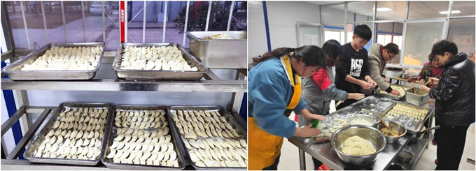 活動(dòng)現(xiàn)場(chǎng),食堂大廚事先將準(zhǔn)備好的餡料擺上桌臺(tái),大家圍成一桌,有的負(fù)責(zé)揪面團(tuán)、有的負(fù)責(zé)搟餃子皮、有的負(fù)責(zé)包餃子,相互間配合默契,分工明確。大家一邊包餃子一邊聊著天,分享著各自家鄉(xiāng)的風(fēng)土人情和飲食習(xí)慣,暢想著未來(lái)的美好生活,每個(gè)人的臉上都洋溢著幸福感。很快,一個(gè)個(gè)獨(dú)具地方特色和個(gè)性的餃子就包好了,從中體會(huì)到的歡樂(lè)、合作、友誼、鄉(xiāng)愁相互雜糅,頓感莫名的溫馨和幸福。
