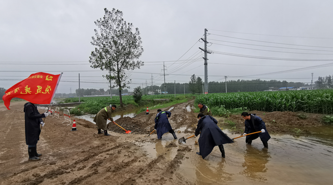 7月17日夜,大雨滂沱,安徽交航利辛縣S338改建工程K13+800-K15+4200新建路基兩側(cè)積水嚴(yán)重。發(fā)現(xiàn)積水嚴(yán)重問(wèn)題后,項(xiàng)目黨支部于7月18日早8:30立即召集S338利辛項(xiàng)目部黨員先鋒隊(duì)、青年突擊隊(duì)集體出動(dòng),積極開展防汛排澇工作。