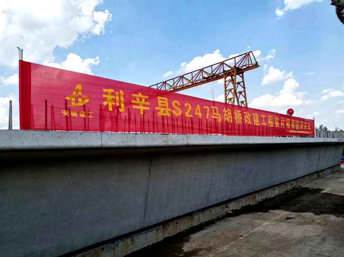 9月3日下午,安徽交航利辛縣S247馬胡橋改建工程施工現(xiàn)場車聲隆隆,重達100噸的30m箱梁隨著吊車的提升,開始進行架設。當日18點15分,隨著吊車掛鉤的摘取,箱梁精準落位在8#墩和9#橋臺臨時支座上方,首片引橋箱梁順利架設完成標志著馬胡橋改建工程進入橋面系及附屬施工階段,向實現(xiàn)年底具備通車條件的目標邁出了堅實一步。