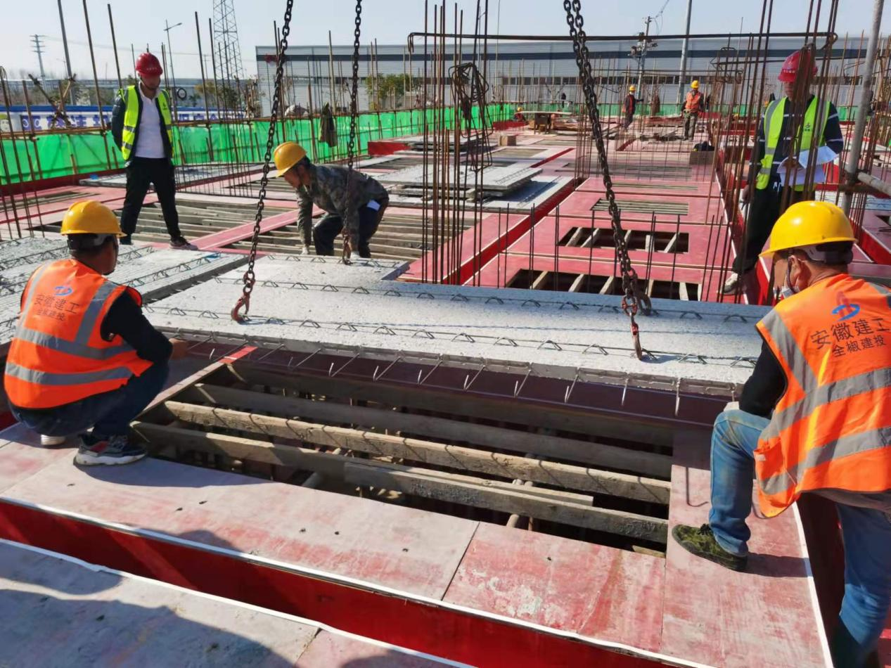 11月15日上午,全椒縣大墅產(chǎn)業(yè)新城電商物流園裝配式EPC項(xiàng)目10#樓首層裝配式疊合樓板順利吊裝。