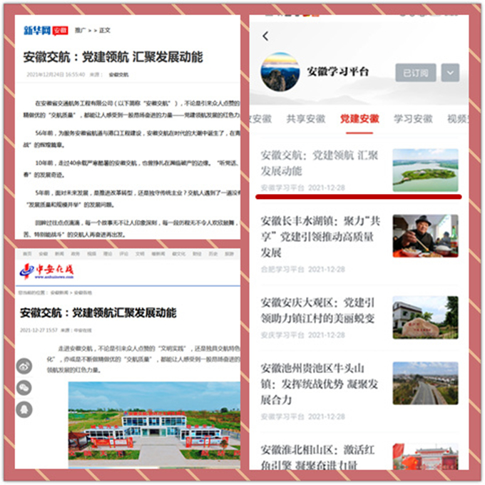 近日,新華社(新華網(wǎng))、學習強國、中安在線等中央及省級主流媒體,紛紛聚焦安徽交航黨建工作,集中報道了十九大以來安徽交航深入學習貫徹習近平新時代中國特色社會主義思想,堅持和加強黨的領導,推進全面從嚴治黨及以黨建領航高質(zhì)量發(fā)展等方面取得的一系列成果。