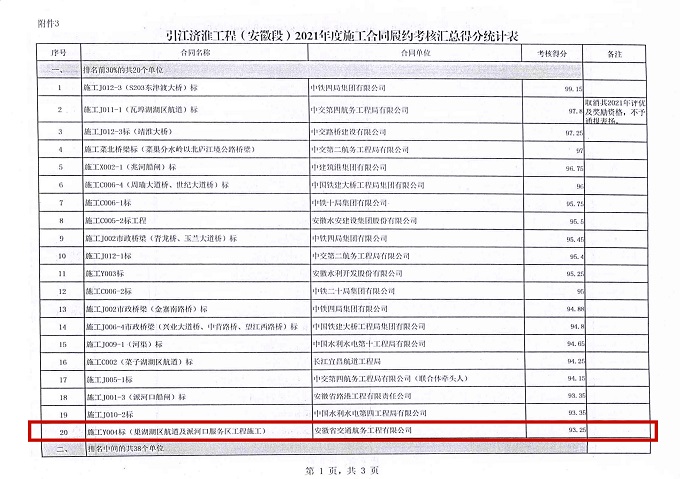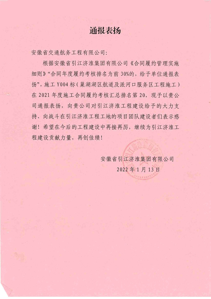 日前,安徽交航公司承建的引江濟(jì)淮工程(安徽段)巢湖湖區(qū)航道及派河口服務(wù)區(qū)工程,在2021年度施工合同履約考核匯總排名中位列前30%,受到業(yè)主單位省引江濟(jì)淮集團(tuán)通報表揚。