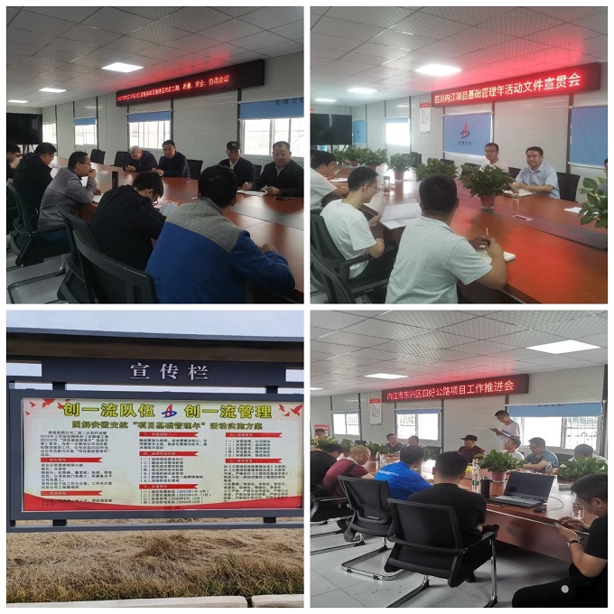 開展學(xué)習(xí)會議,宣傳活動精神。公司“項目基礎(chǔ)管理年”活動方案發(fā)布后,2021年內(nèi)江市東興區(qū)道路基礎(chǔ)設(shè)施建設(shè)工程項目部立即召開專題會議傳達(dá)活動精神。項目部還在宣傳欄中制作了“項目基礎(chǔ)管理年”專題展板,以此來對活動精神進(jìn)行傳達(dá)與宣傳。