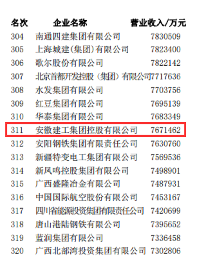 2022年9月6日,中國企業(yè)聯(lián)合會、中國企業(yè)家協(xié)會在京舉辦新聞發(fā)布會,發(fā)布了“2022中國企業(yè)500強(qiáng)”榜單。安徽建工集團(tuán)以767.15億元的營業(yè)收入位列榜單第311位,連續(xù)14年榮登中國企業(yè)500強(qiáng),較2021年的327位提升16位,保持總體平穩(wěn)、穩(wěn)中有進(jìn)的發(fā)展態(tài)勢,品牌影響力和價值有效提升。
