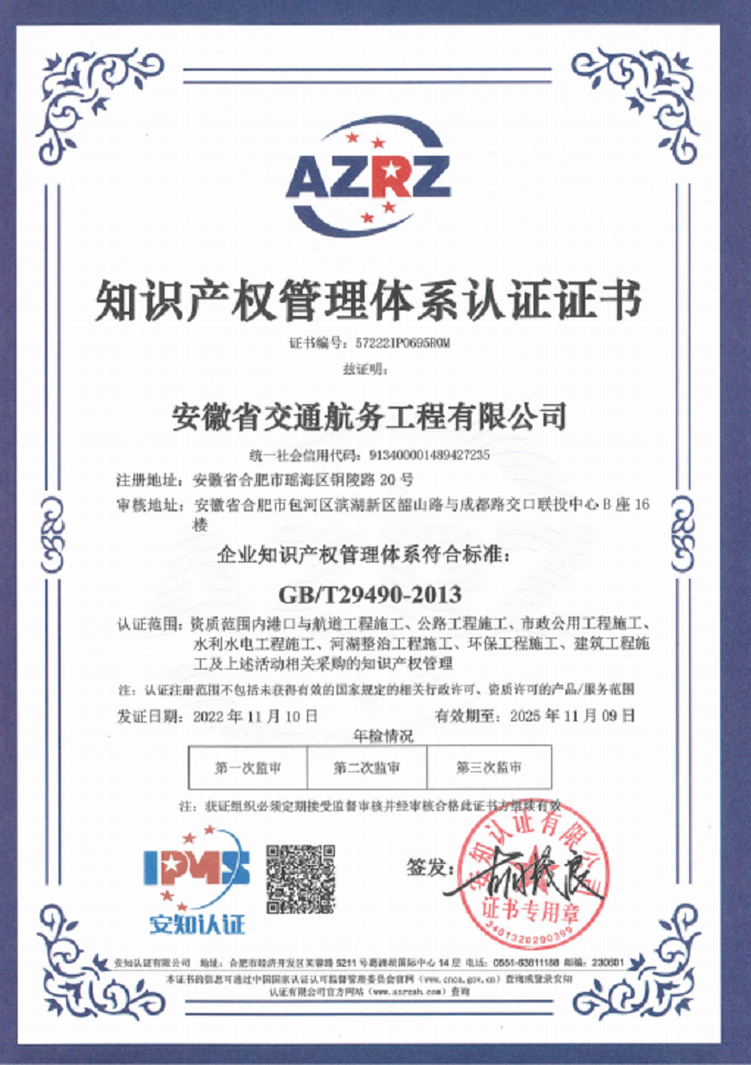 11月10日,安徽省交通航務工程有限公司知識產(chǎn)權(quán)管理體系順利通過認證,標志著安徽交航知識產(chǎn)權(quán)管理工作邁入全面提升新階段。