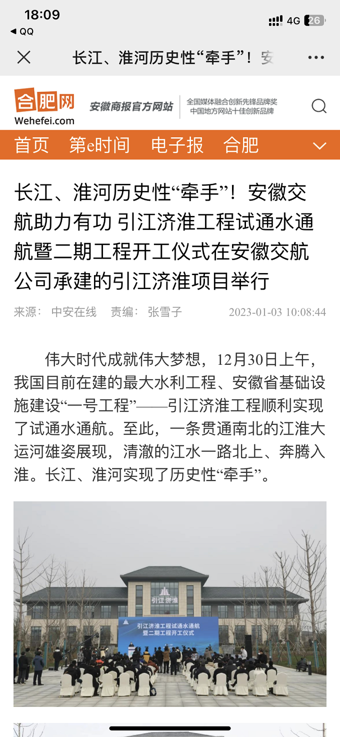 1月3日,安徽商報發(fā)布報道引江濟淮工程試通水通航暨二期工程開工儀式在安徽交航公司承建的引江濟淮項目舉行。