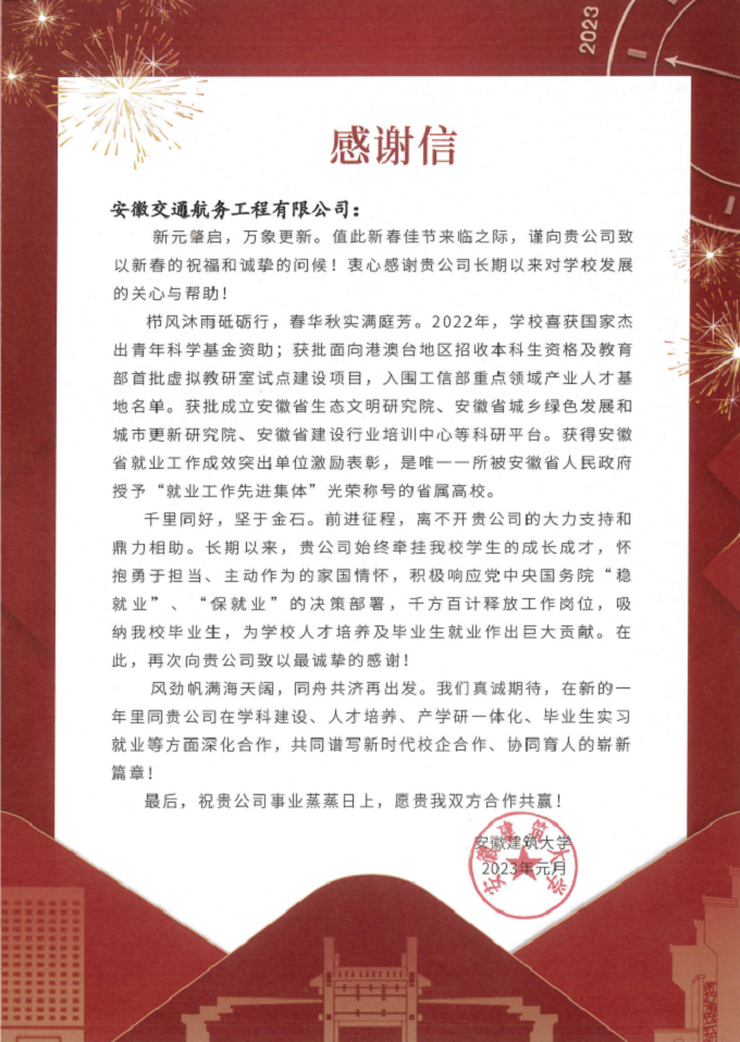 1月19日,安徽交航公司收到安徽建筑大學(xué)發(fā)來的感謝信。信中表示,安徽交航公司長(zhǎng)期以來吸納安徽建筑大學(xué)畢業(yè)生,為學(xué)校人才培養(yǎng)及畢業(yè)生就業(yè)作出巨大貢獻(xiàn),特向我公司表示感謝。