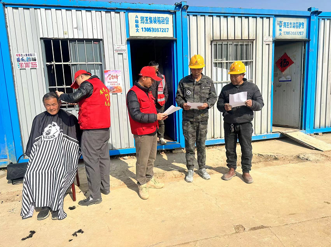 潭沖河家園項目發(fā)動青年志愿者們?yōu)轫椖抗と税l(fā)放文明宣傳手冊,講解宣傳合肥市民公約(守則),同時團(tuán)支部組織志愿者服務(wù)活動,為工人提供義務(wù)理發(fā)。