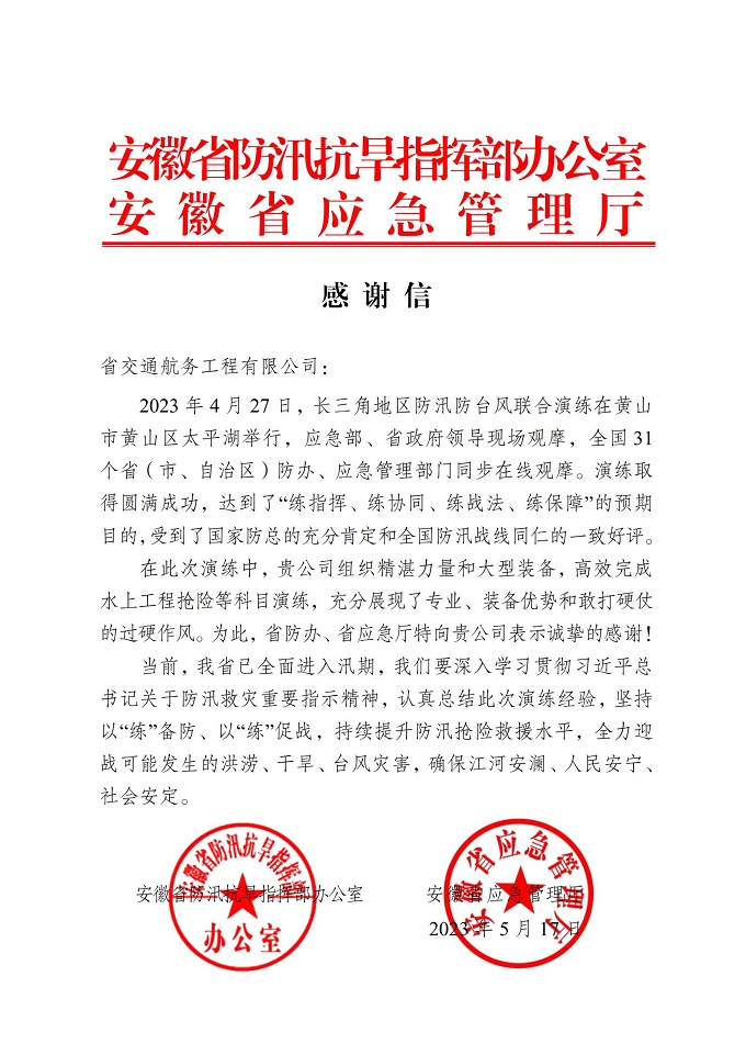 日前,公司收到安徽省應(yīng)急管理廳、安徽省防汛抗旱指揮部辦公室感謝信,對在長三角地區(qū)防汛防臺風聯(lián)合演練中,公司積極參與配合,組織精湛力量和大型裝備,高效完成水上工程搶險等科目演練表示誠摯感謝。