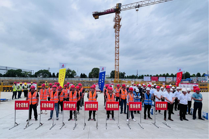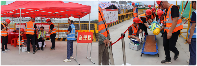 演練主要模擬現(xiàn)場工人施工過程中高溫中暑以及不慎從高處墜落致傷等情況。演練開始后,項目部立即啟動應急預案,對現(xiàn)場人員進行搶救、警戒、疏散、物資保障,及時送往醫(yī)院救治,順利完成了救援任務。