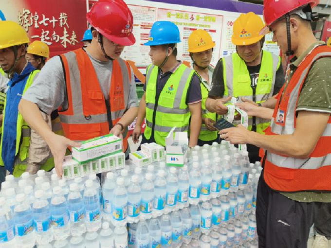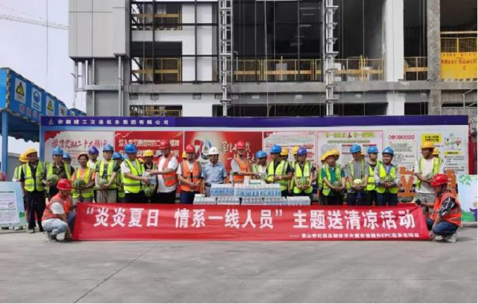 為貫徹落實(shí)公司及黃山市住建局有關(guān)安全工作要求,切實(shí)做好高溫天氣施工防暑降溫工作。近日,黃山世紀(jì)園總部經(jīng)濟(jì)大廈項(xiàng)目部組織開展“炎炎夏日 情系一線人員”送清涼活動(dòng),為現(xiàn)場(chǎng)作業(yè)人員發(fā)放毛巾、鹽汽水、風(fēng)油精、清涼油等防暑降溫物資。