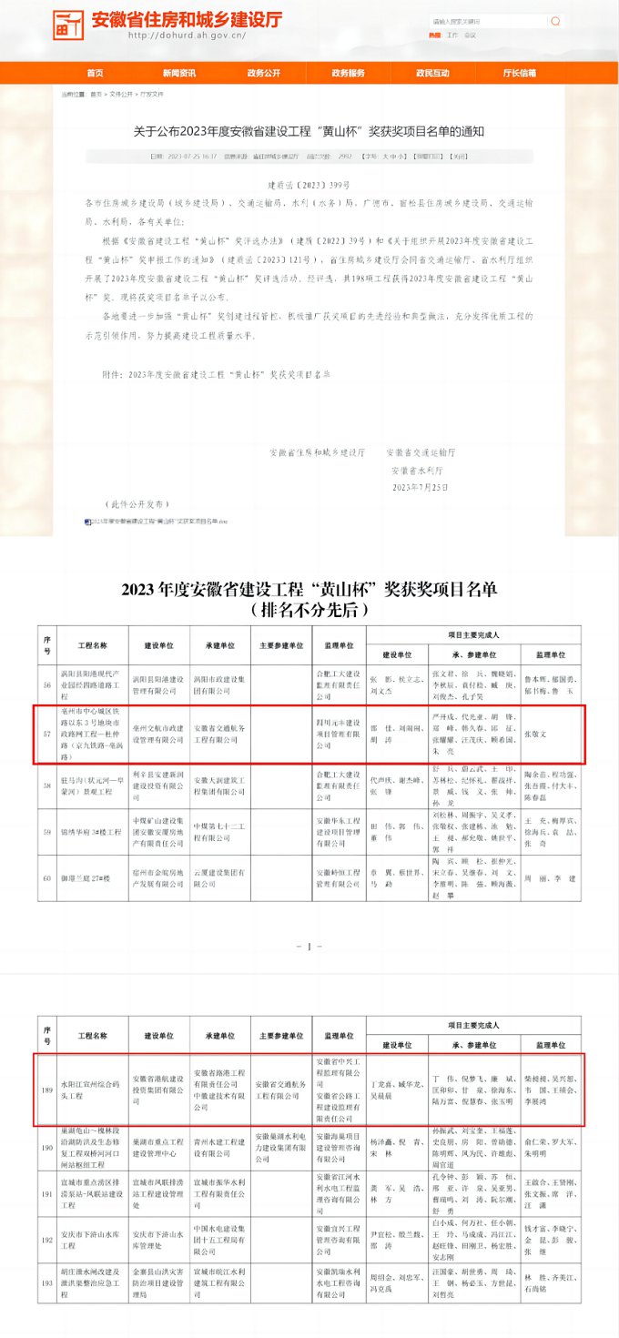 7月25日,省住建廳公布2023年度安徽省建設(shè)工程“黃山杯”獎獲獎項(xiàng)目名單,建工交航承建的亳州市中心城區(qū)鐵路以東3號地塊市政路網(wǎng)工程項(xiàng)目以及參建的水陽江宣州綜合碼頭工程位列榜單、喜獲殊榮。
