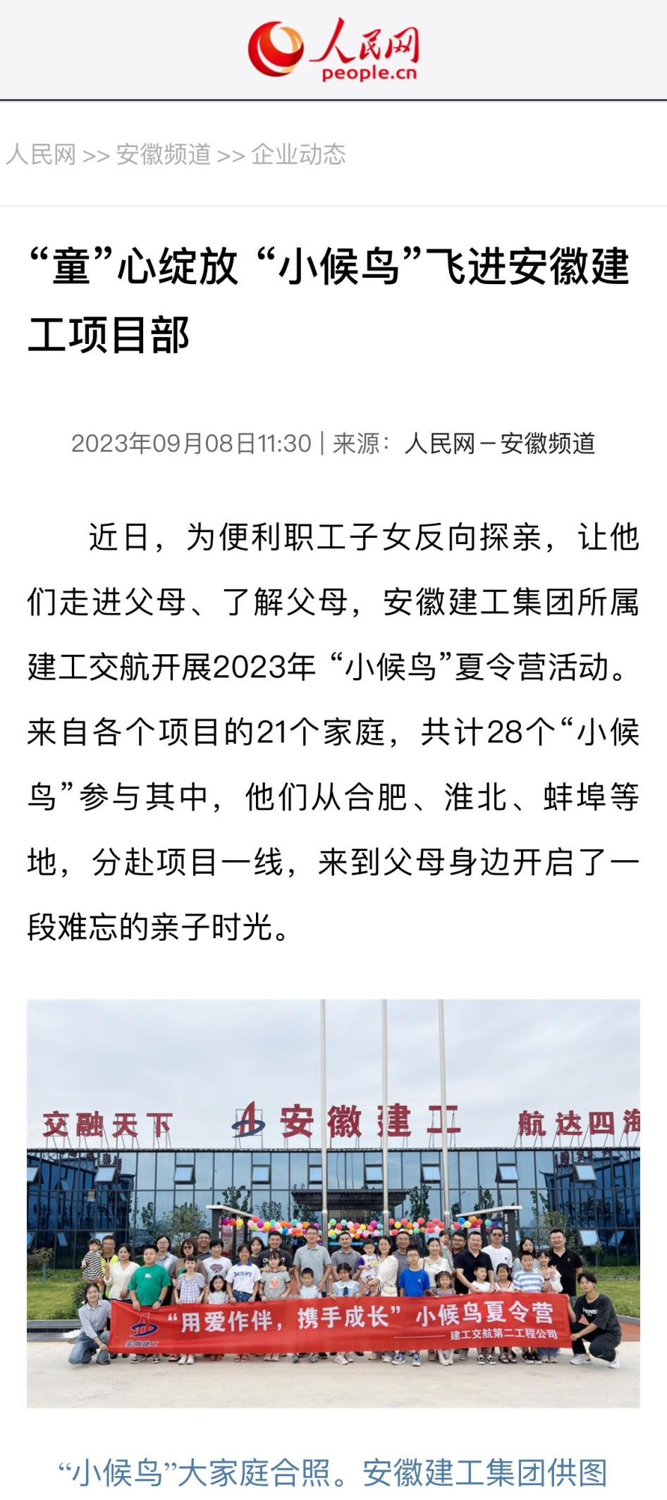 人民網安徽頻道以《“童”心綻放“小候鳥”飛進安徽建工項目部》為題,報道建工交航“小候鳥”夏令營活動。
