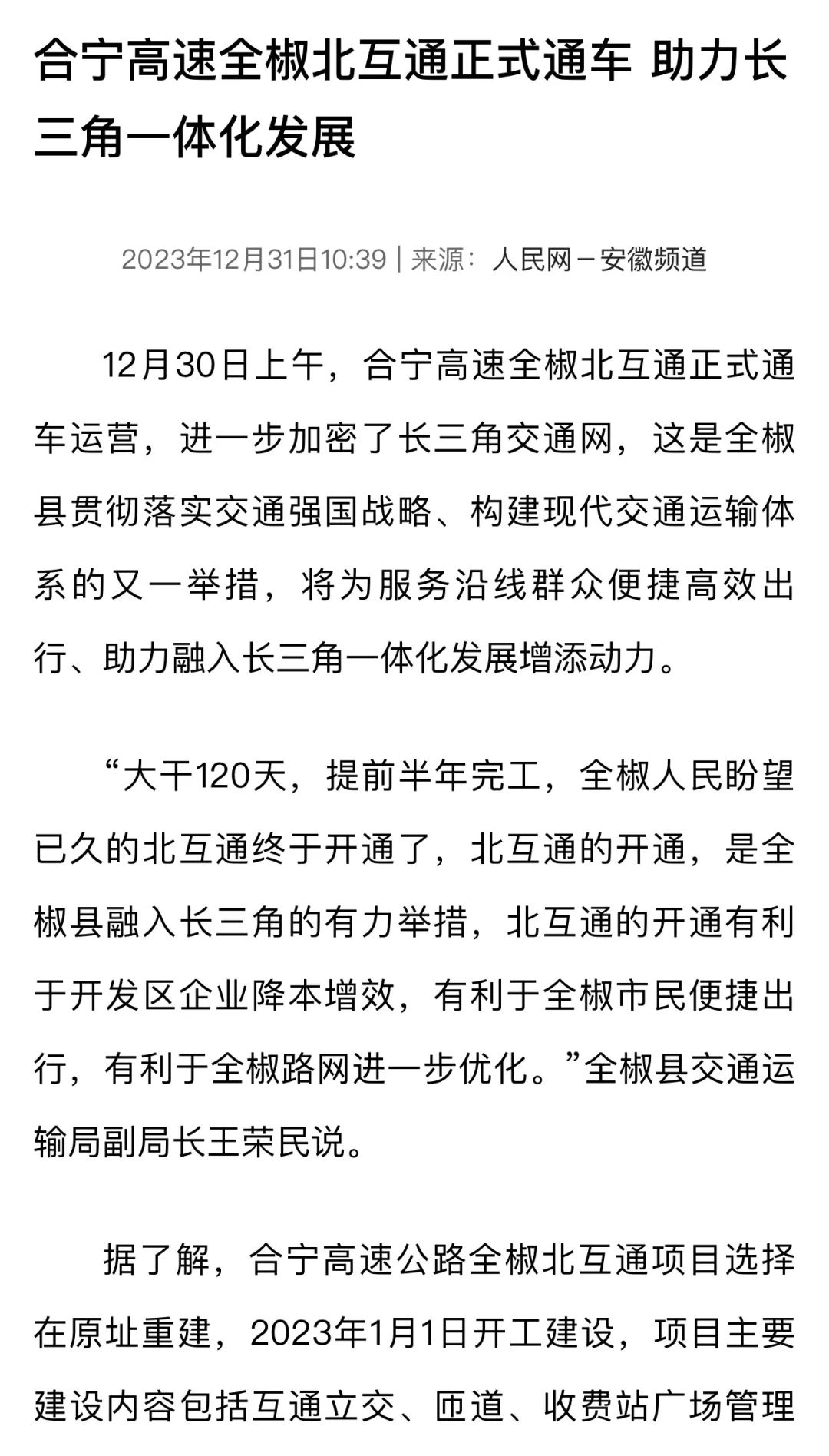 人民網(wǎng)安徽頻道以《合寧高速全椒北互通正式通車 助力長三角一體化發(fā)展》為題,報(bào)道合寧高速公路全椒北互通項(xiàng)目通車儀式的舉行。