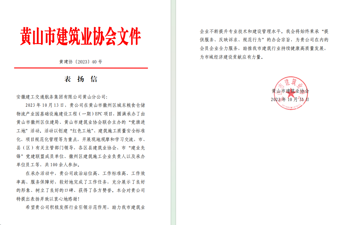 10月31日,建工交航黃山分公司收到黃山市建筑業(yè)協(xié)會(huì)發(fā)來(lái)的表?yè)P(yáng)信。信中對(duì)黃山分公司在所屬徽州區(qū)城東糧食倉(cāng)儲(chǔ)物流園項(xiàng)目圓滿(mǎn)承辦“黨旗進(jìn)工地”活動(dòng)予以充分肯定。