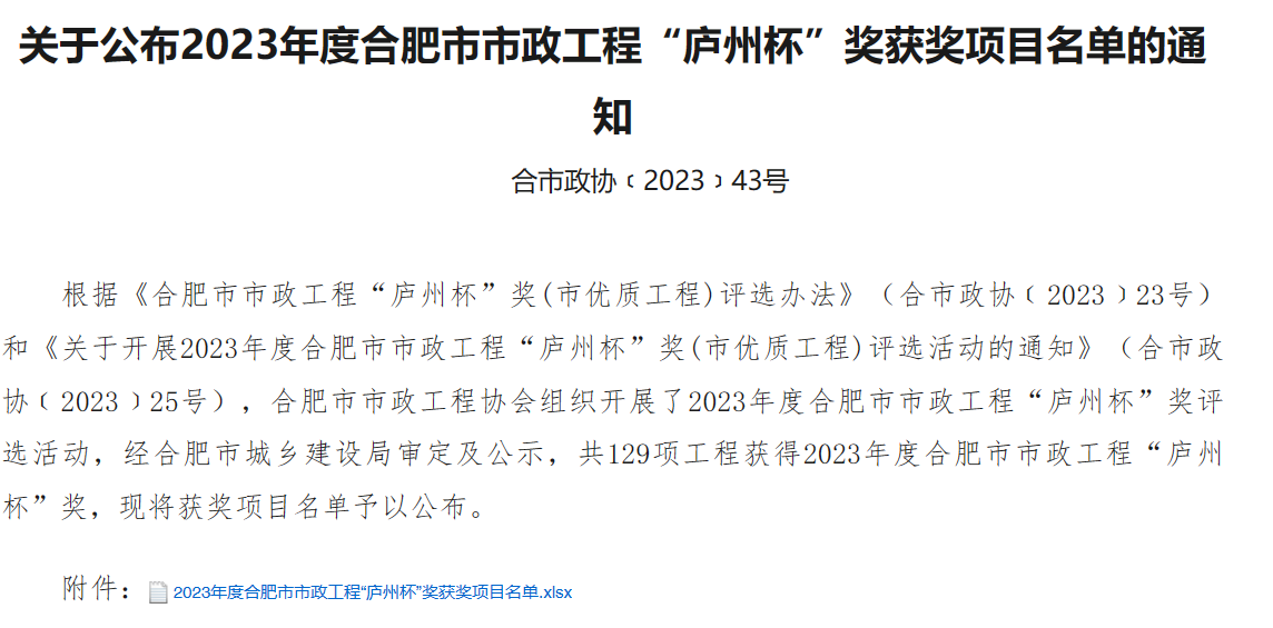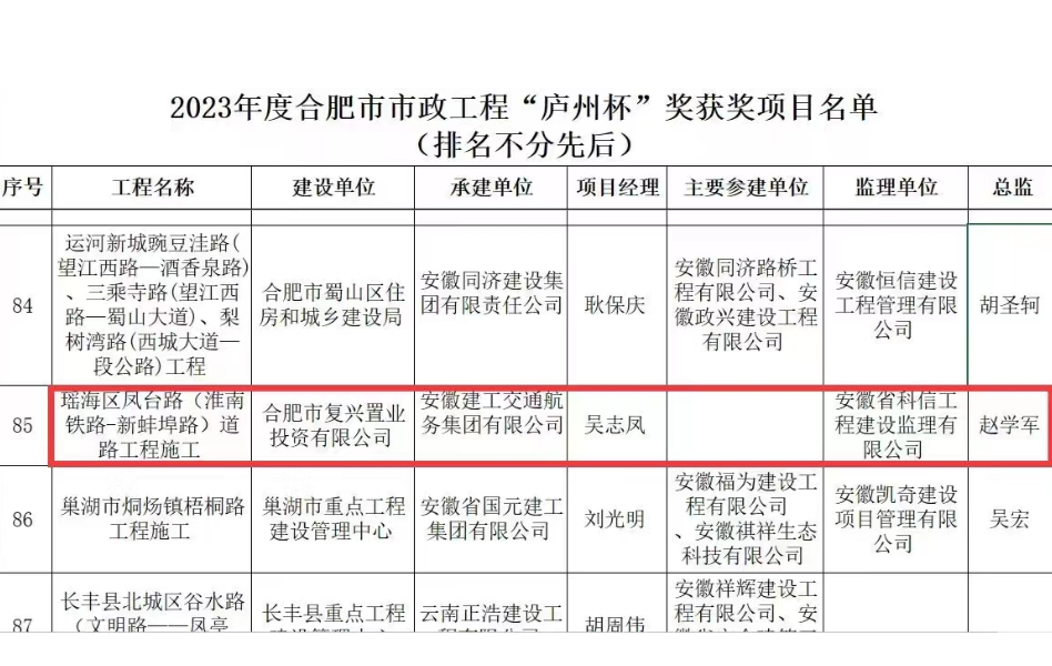 近日,2023年度合肥市市政工程“廬州杯”獎已公示完畢,建工交航承建的瑤海區(qū)鳳臺路(淮南鐵路-新蚌埠路)道路工程市政項目順利通過評審,榮獲該獎項。“廬州杯”獎是由合肥市市政工程協(xié)會組織評審,經(jīng)合肥市城鄉(xiāng)建設局審定,是合肥市市政工程建設領域最高質(zhì)量獎。