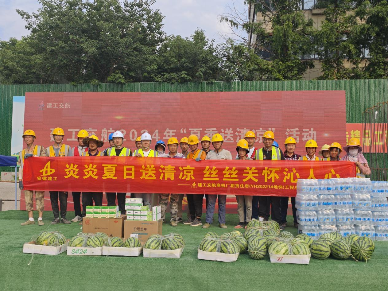 項(xiàng)目部管理人員共同為一線工人們送上了藿香正氣水、十滴水、西瓜、清涼飲品等防暑藥品和清涼物資,叮囑大家注意防暑,保障自身的安全健康。