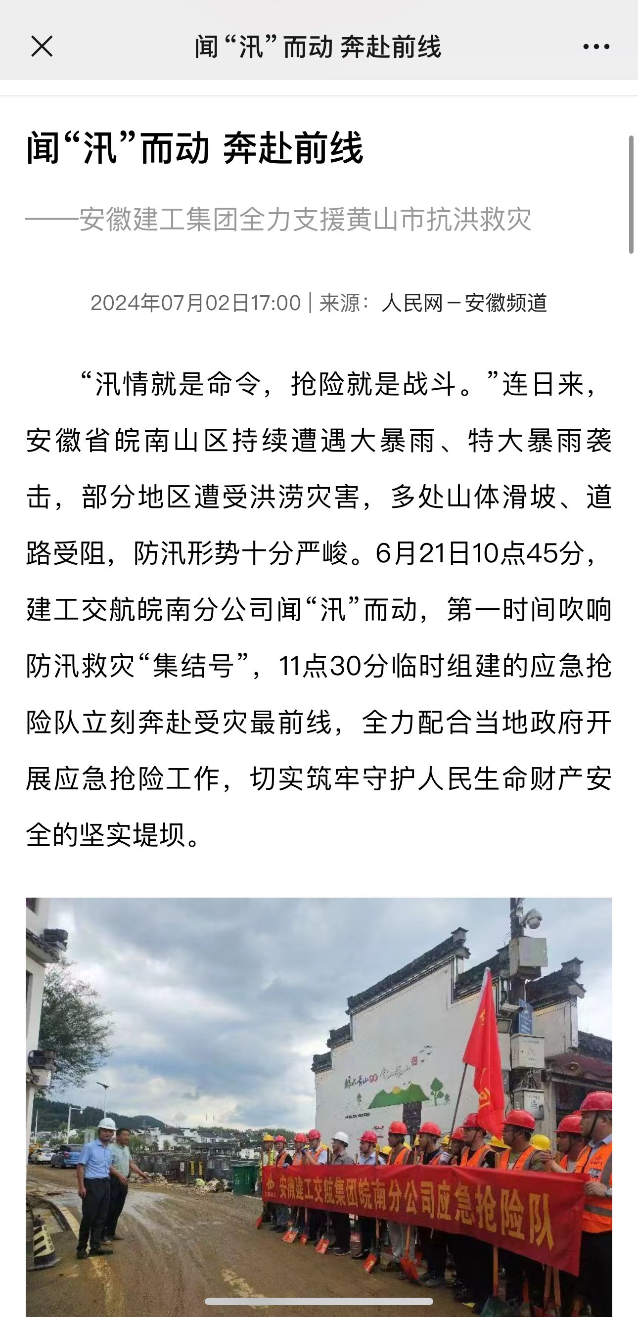 人民網(wǎng)安徽頻道以《聞“汛”而動 奔赴前線——安徽建工集團(tuán)全力支援黃山市抗洪救災(zāi)》為題報道建工交航皖南分公司的搶險工作。
