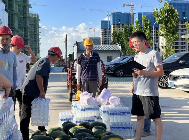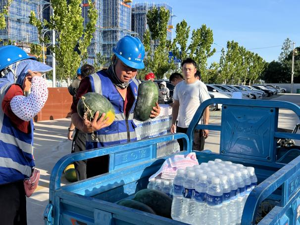 活動(dòng)現(xiàn)場(chǎng),項(xiàng)目部為現(xiàn)場(chǎng)一線工人代表送上了礦泉水、西瓜、藥品等防暑降溫物品,向他們表示親切問候,感謝他們一直以來的辛苦付出,叮囑他們?cè)诟邷靥鞖庀乱⒁鈩谝萁Y(jié)合、做好防護(hù),確保自身健康和安全。