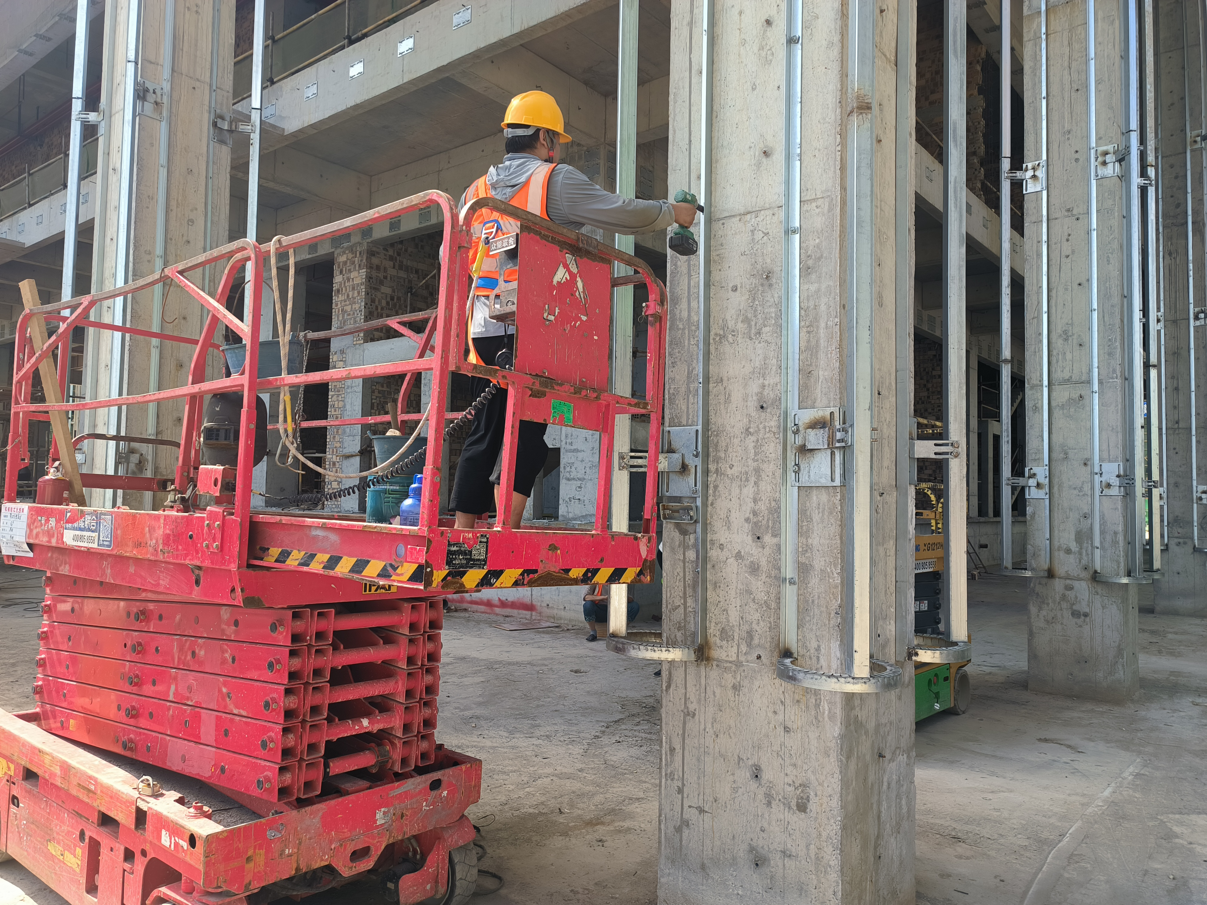 ▲淮南壽縣保障房項(xiàng)目-幕墻班組工人安裝支架