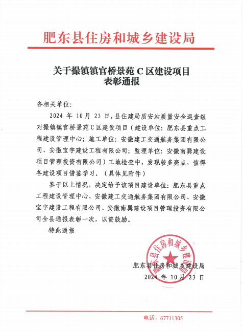 近日,公司在建撮鎮(zhèn)鎮(zhèn)官橋景苑拆遷恢復樓C區(qū)建設(shè)項目喜獲肥東縣住房和城鄉(xiāng)建設(shè)局全縣通報表彰。