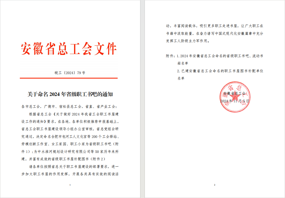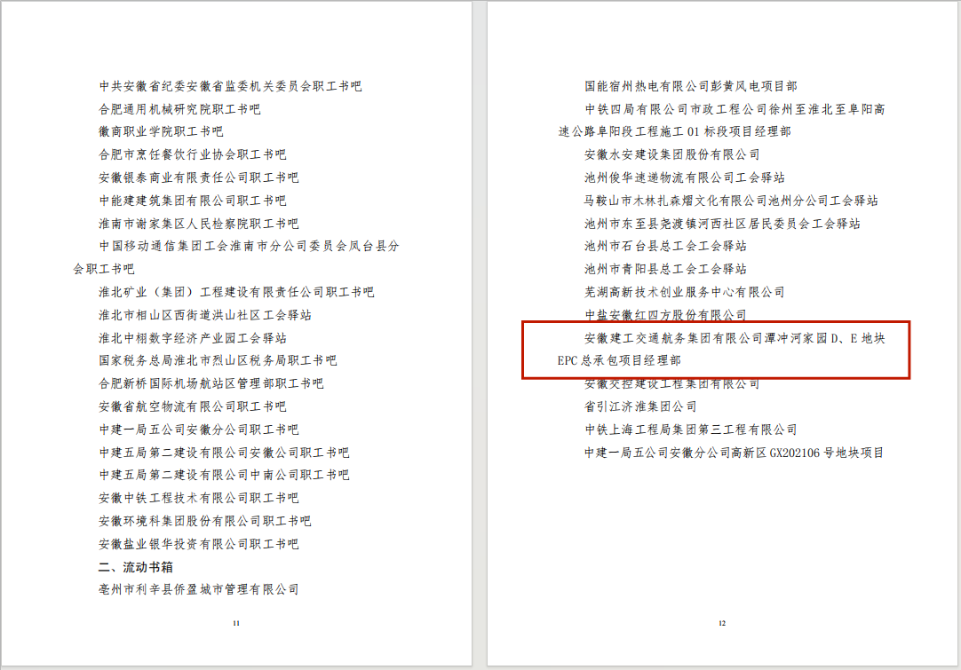 近日,安徽省總工會(huì)發(fā)布《關(guān)于命名2024年省級職工書吧的通知》,公司潭沖河家園項(xiàng)目榜上有名,獲評2024年安徽省總工會(huì)“流動(dòng)書箱”榮譽(yù)稱號。