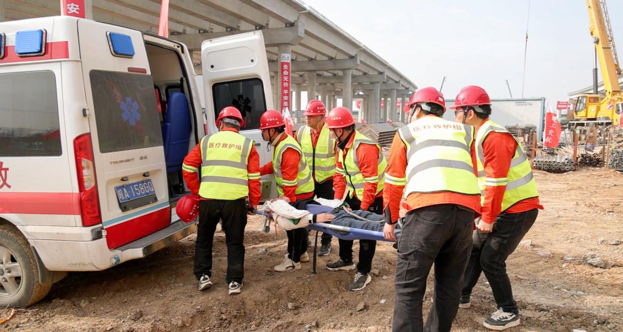 本次演練模擬了在夏閣東樞紐 E 匝道現(xiàn)澆梁支架拆除施工時(shí),一名工人因未妥善系掛安全帶,失足從支架墜落至地面受傷的場(chǎng)景,全面檢驗(yàn)應(yīng)急預(yù)案實(shí)效性。