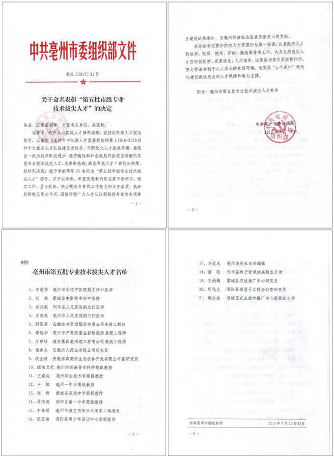 方申柱同志被授予“亳州市第五批專業(yè)技術(shù)拔尖人才”稱號